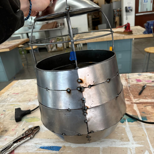 Cartoon duck sculpture made of 3/16 steel rods and 18 gauge steel plates. The design was created in Adobe Illustrator, and those schematics were used to bend the steel rods into the ducks form. Sheet metal was then cut and bent by hand to fit each panel of the ducks wireframe.