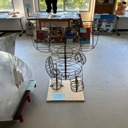 This is a sculpture made of 3/16 steel rods and 22 gauge sheet metal. The elephant was designed in Cinema 4D and Adobe Illustrator. Those schematics were used to manually bend the steel rods into the shape of the elephants, creating the wireframe. The sheet metal is cut and bent to fit each panel, filling in the elephants body. The sculpture is about 4 feet tall by 3 feet wide